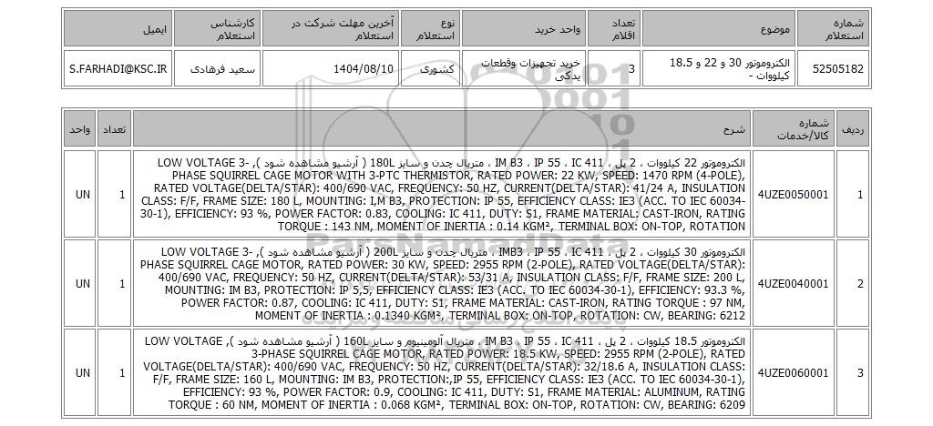 | 52505182 | الکتروموتور 30 و 22 و 18.5 کیلووات - | 3 | خرید تجهیزات وقطعات یدکی | کشوری | 1404/08/10 | سعید فرهادی | S.FARHADI@KSC.IR |