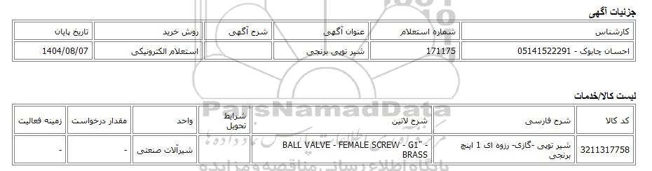 | احسان چابوک - 05141522291 | 171175 | شیر توپی برنجی | استعلام الکترونیکی | 1404/08/07 |