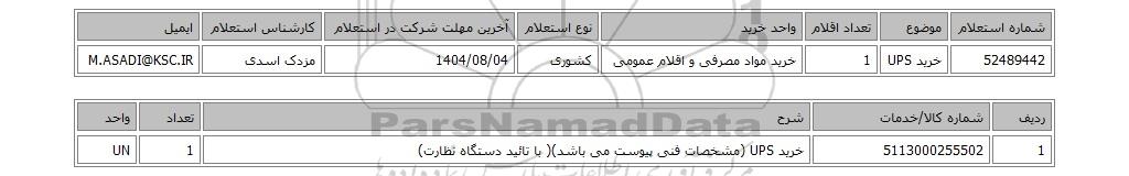 | 52489442 | خرید UPS | 1 | خرید مواد مصرفی و اقلام عمومی | کشوری | 1404/08/04 | مزدک اسدی | M.ASADI@KSC.IR |