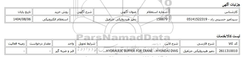 | سیدامیر حسینی راد - 05141522319 | 158879 | دمپر هیدرولیکی جرثقیل | استعلام الکترونیکی | 1404/08/06 |