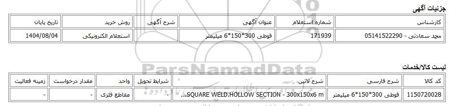 | 1150720028 | قوطی 300*150*6 میلیمتر | SQUARE WELD.HOLLOW SECTION - 300x150x6 m... | - | مقاطع فلزی | - | - |