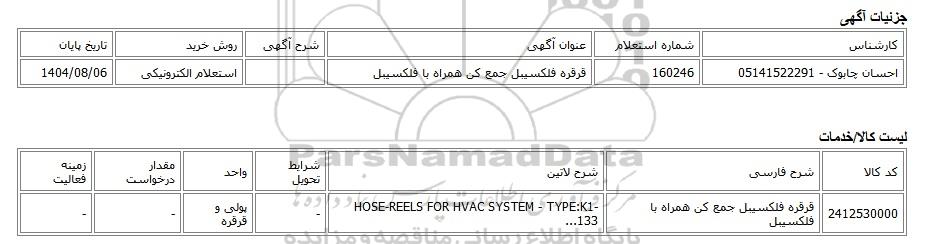 | احسان چابوک - 05141522291 | 160246 | قرقره فلکسیبل جمع کن همراه با فلکسیبل | استعلام الکترونیکی | 1404/08/06 |