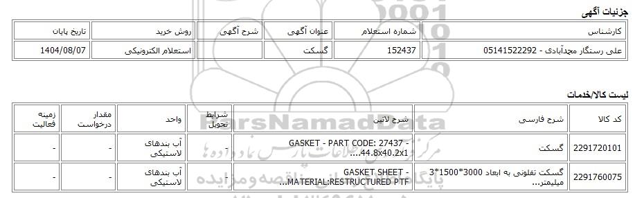 2291760075گسکت تفلونی به ابعاد 3000*1500*3 میلیمتر...GASKET SHEET - MATERIAL:RESTRUCTURED PTF... -آب بندهای لاستیکی--