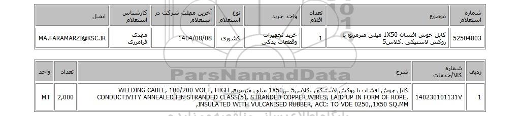 52504803 کابل جوش افشان 1X50 میلی مترمربع با روکش لاستیکی .کلاس5 1خرید تجهیزات وقطعات یدکیکشوری1404/08/08مهدی فرامرزیMA.FARAMARZI@KSC.IR