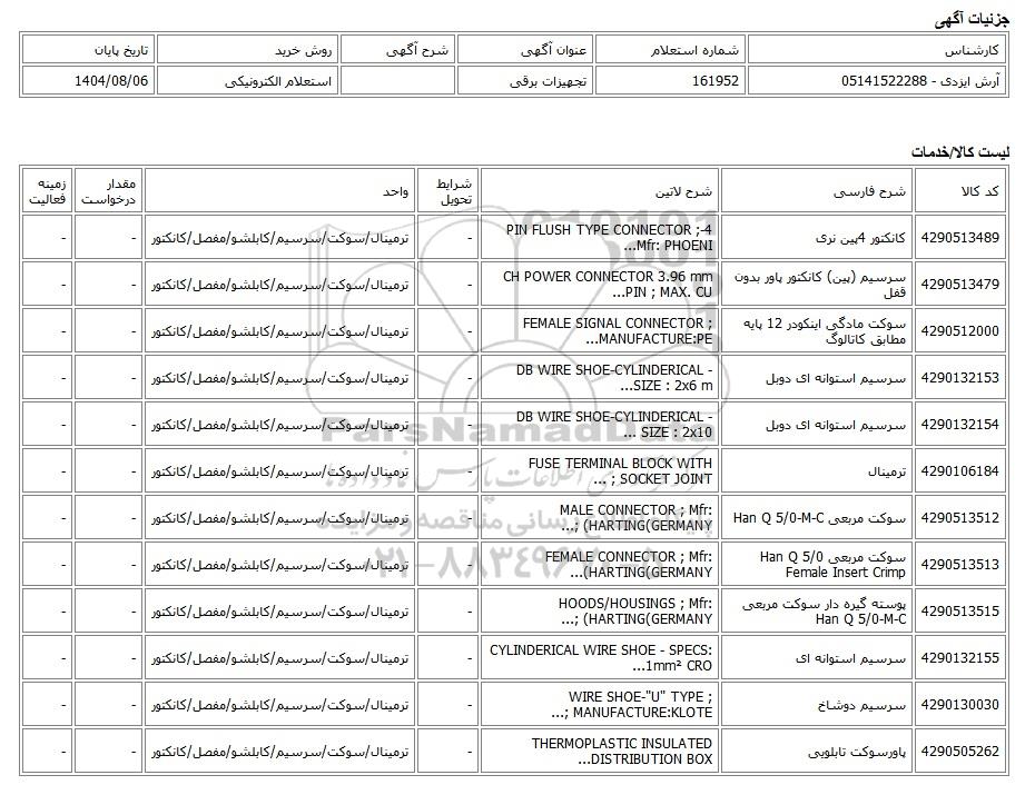 | آرش ایزدی - 05141522288 | 161952 | تجهیزات برقی | استعلام الکترونیکی | 1404/08/06 |