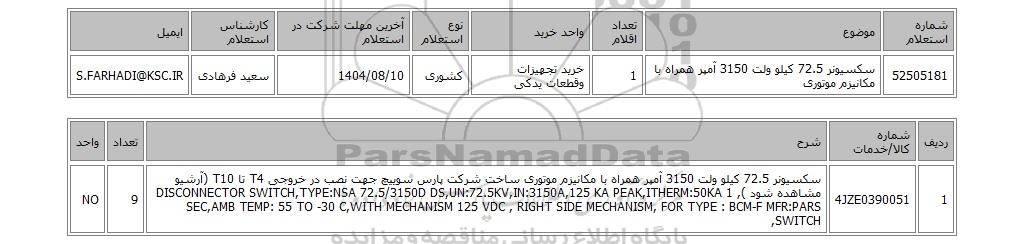 | 52505181 | سکسیونر 72.5 کیلو ولت 3150 آمپر همراه با مکانیزم موتوری | 1 | خرید تجهیزات وقطعات یدکی | کشوری | 1404/08/10 | سعید فرهادی | S.FARHADI@KSC.IR |