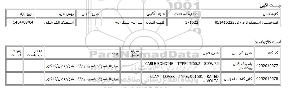 | امیرحسین اسعدی نژاد - 05141522302 | 171522 | کلمپ انتهایی سه پیچ شبکه برق | استعلام الکترونیکی | 1404/08/04 |