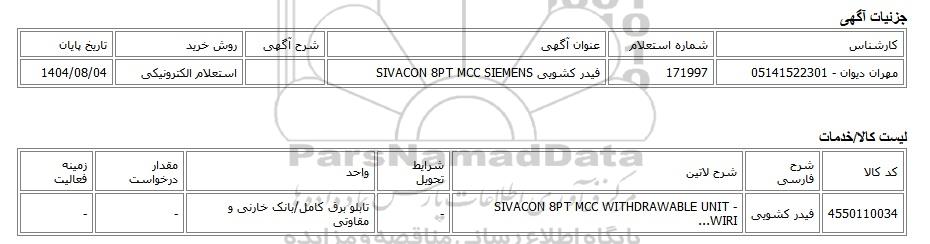 مهران دیوان - 05141522301171997فیدر کشویی SIVACON 8PT MCC SIEMENSاستعلام الکترونیکی1404/08/04
