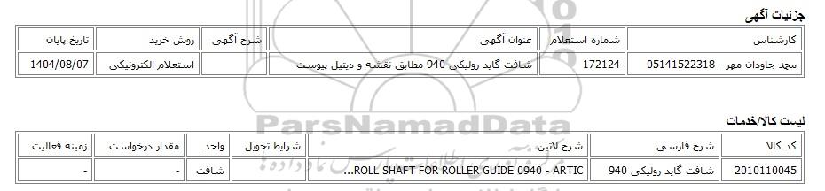 | محمد جاودان مهر - 05141522318 | 172124 | شافت گاید رولیکی 940 مطابق نقشه و دیتیل پیوست | استعلام الکترونیکی | 1404/08/07 |