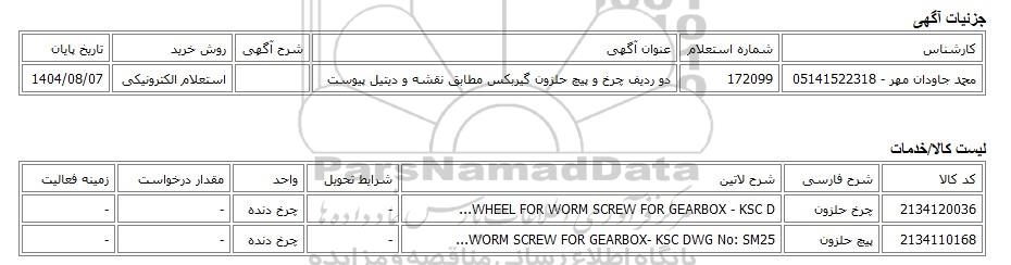 | محمد جاودان مهر - 05141522318 | 172099 | دو ردیف چرخ و پیچ حلزون گیربکس مطابق نقشه و دیتیل پیوست | استعلام الکترونیکی | 1404/08/07 |