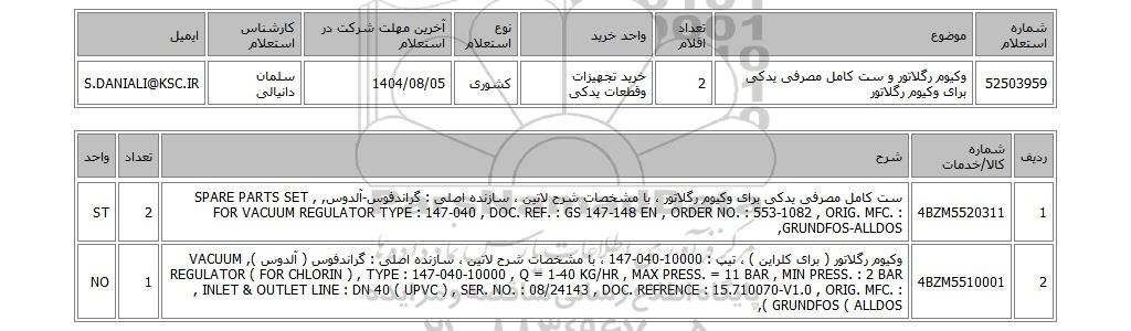 52503959وکیوم رگلاتور و ست کامل مصرفی یدکی برای وکیوم رگلاتور2خرید تجهیزات وقطعات یدکیکشوری1404/08/05سلمان دانیالیS.DANIALI@KSC.IR