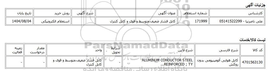 | علی ناصرنیا - 05141522299 | 171999 | کابل فشار ضعیف،متوسط و قوی و کابل کنترل | استعلام الکترونیکی | 1404/08/04 |