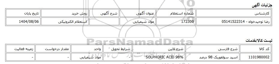 | رضا توحیدخواه - 05141522314 | 172300 | مواد شیمیایی | استعلام الکترونیکی | 1404/08/06 |