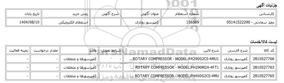 | محمد سعادتی - 05141522290 | 156509 | کمپرسور روتاری | استعلام الکترونیکی | 1404/08/10 |