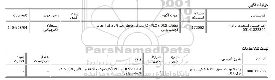 | امیرحسین اسعدی نژاد - 05141522302 | 172002 | قطعات DCS و PLC (کارت،رک،حافظه و...)/نرم افزار های اتوماسیونی | استعلام الکترونیکی | 1404/08/04 |