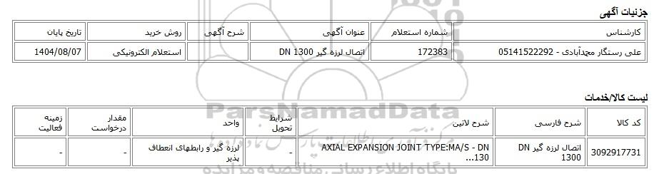 | علی رستگار محمدآبادی - 05141522292 | 172383 | اتصال لرزه گیر DN 1300 | استعلام الکترونیکی | 1404/08/07 |