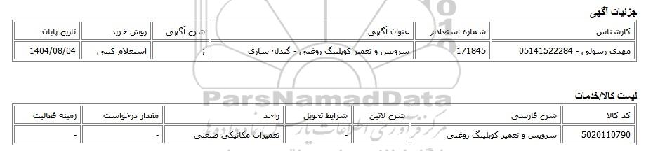 مهدی رسولی - 05141522284171845سرویس و تعمیر کوپلینگ روغنی - گندله سازی;استعلام کتبی1404/08/04