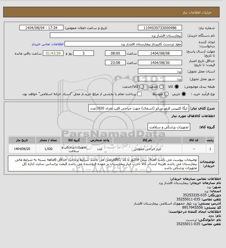 شرح کلی نیاز: لیگا کلیپس قرمز سایز (اسمال) جهت جراحی قلب تعداد 1920عدد