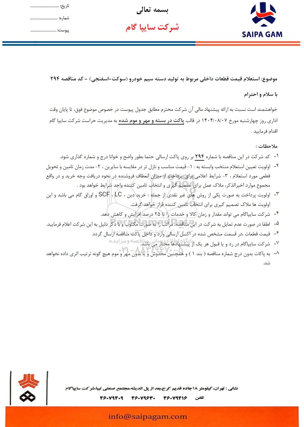 خواهشمند است نسبت به ارائه پیشنهاد مالی آن شرکت محترم مطابق جدول پیوست در خصوص موضوع فوق، تا پایان وقت اداری روز چهارشنبه مورخ 1404.08.07 در قالب پاکت در بسته و مهر و موم شده به مدیریت حراست شرکت سایپا گام اقدام فرمایید.