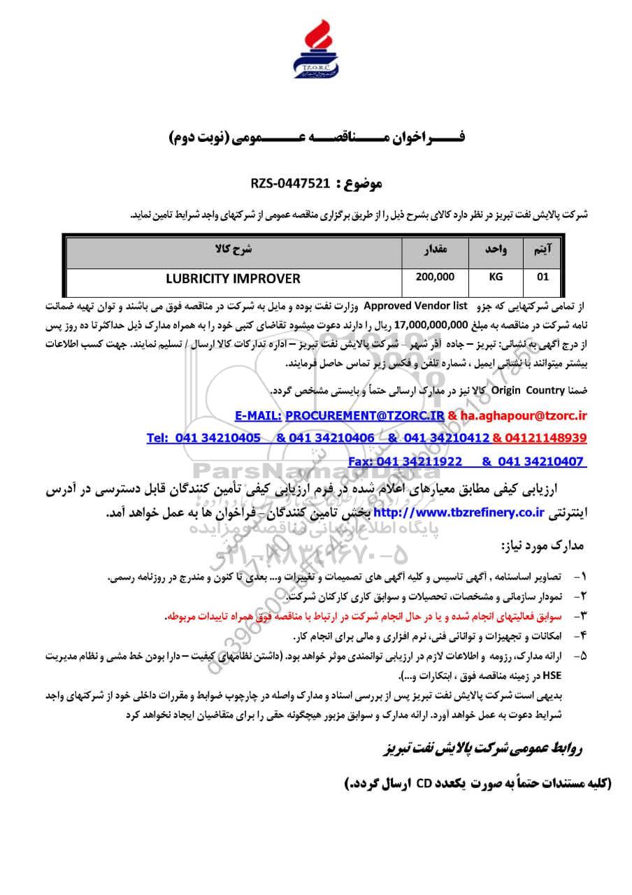 از تمامی شرکت هایی که جزو Approved vendor list وزارت نفت بوده و مایل به شرکت در مناقصه فوق می باشند و توان تهیه ضمانت نامه شرکت در مناقصه به مبلغ 17.000.000.000 ریال را دارند، دعوت می شود تقاضای کتبی خود را به همراه مدارک ذیل حداکثر تا ده روز پس از درج آگهی به نشانی: تبریز - جاده آذرشهر-  شرکت پالایش نفت تبریز  - اداره تدارکات کالا ارسال / تسلیم نمایند. جهت کسب اطلاعات بیشتر می توانید با نشانی ایمیل، شماره تلفن و فکس زیر تماس حاصل فرمایید.