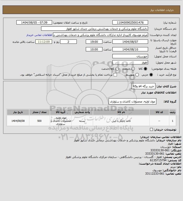 | 1 | -- | کاغذ چاپگر یا کپی | بسته | مواد اولیه، محصولات کاغذی و سلولزی | 500 | 1404/08/08 |