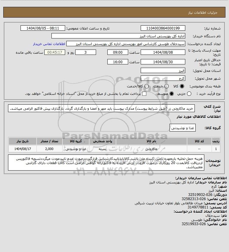نام دستگاه خریدار:اداره کل بهزیستی استان البرز