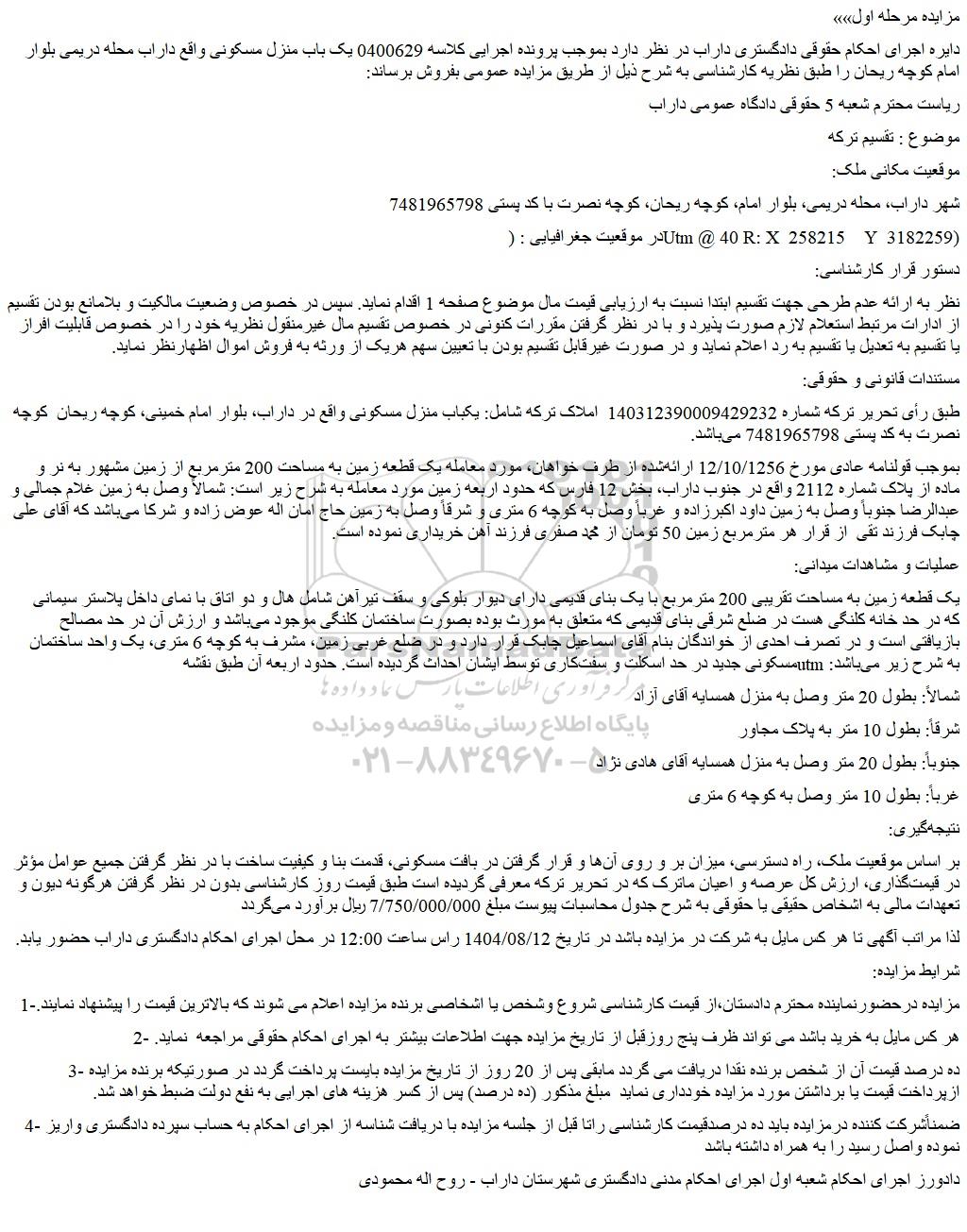 لذا مراتب آگهی تا هر کس مایل به شرکت در مزایده باشد در تاریخ 1404/08/12 راس ساعت 12:00 در محل اجرای احکام دادگستری داراب حضور یابد.
