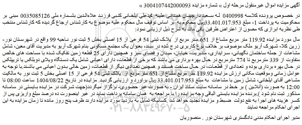 مال مورد مزایده 119.92 متر مربع مشاع از 651 متر مربع از  پلاک ثبتی 54 فرعی از 15 اصلی بخش 5 ثبت نور ناحیه 99 واقع در شهرستان نور- زرین کلا- شهرک آریو ملک موصوف بر خلاف نوع کاربری درج شده در سند، بعنوان یک مجتمع مسکونی بنام شهرک آریو به مدیریت آقای معین، شامل مشاعات از جمله ساختمان نگهبانی، سرایداری، مدیریت، خیابان، میدان و فضای سبز و همچنین دارای 25 قطعه زمین تفکیک شده با مساحت های خالص متفاوت از 339 مترمربع تا 774 مترمربع در حال بهره برداری می باشد که برخی از قطعات، دارای اعیانی شامل یک دستگاه ویلای دوبلکس یا تریپلکس در حال بهره برداری بوده و تعدادی از قطعات، در حال ساخت هستند و همچنین تعدادی دیگر از قطعات، زمین خالی بدون اعیانی می باشند.با توجه به عوامل زمانی وموقعیت مکانی ارزش مزایده 119.92 متر مربع مشاع از 651 متر مربع از  پلاک ثبتی 54 فرعی از 15 اصلی بخش 5 ثبت نور به مالکیت مشاعی آقای ایلخانی، شامل زمین با مشاعات  به مبلغ 33.401.017.953 ریال براورد و ارزیابی گردید. مزایده در تاریخ 1404/08/22 ساعت 08:00 تا 12:00 به صورت (آنلاین ) بر خط در سامانه سایت ستاد ایران - به صورت غیر حضوری- برگزار میگردد(جهت شرکت در مزایده بایستی در سامانه مذکور ثبت نام شود ).برنده مزایده بایستی الباقی وجه مزایده را با مراجعه به  همان سامانه پرداخت نماید در غیر اینصورت ده درصد مبلغ واریزی پس از کسر هزینه های اجرا به نفع دولت  ضبط و مزایده تجدید خواهد شد .کسانیکه تمایل به بازدید مورد مزایده دارند ظرف پنج روز مانده تا زمان مزایده به این اجرای احکام مراجعه نمایند