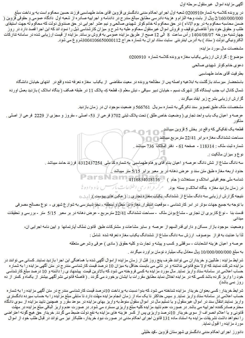 در پرونده کلاسه به شماره0200910 شعبه اول اجرای احکام مدنی دادگستری قزوین اقای حامد طهماسبی فرزند حسین محکوم است به پرداخت مبلغ 2/160/000/000 ریال از بابت وجه التزام و هزینه دادرسی مطابق مبالغ مندرج در دادنامه و اجراییه صادره از شعبه اول  دادگاه عمومی و حقوقی قزوین ( ضمن محاسبه محکوم به در یوم الاداء ) در حق محکوم له خانم کوثر شهیدی صالحی و نیم عشر اجرایی در حق صندوق دولت که محکوم له جهت استیفای طلب و حقوق خود بدواً تقاضای توقیف و فروش اموال غیرمنقول محکوم علیه به شرح و میزان کارشناسی ذیل را نمود اند که این اجرا قصد دارد در روز چهارشنبه مورخه  1404/08/07 رأس ساعت  8  الی 12 صبح از طریق مزایده عمومی به فروش برساند. مزایده از قیمت ارزیابی شده در سامانه تدارکات الکترونیکی دولت ( ستاد ) به آدرس اینترنتی  سایت ستاد ایران به شماره حراج 3004106650000112شروع می شود.