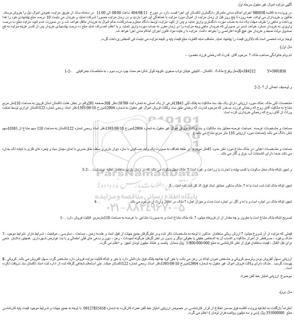 در پرونده به کلاسه 980038 اجرای احکام مدنی متمرکز دادگستری تاکستان این اجرا قصد دارد در مورخ 404/08/11 ساعت 08:00 الی 11:00 در سامانه ستاد از طریق مزایده عمومی اموال ذیل را بفروش برساند. طالبین و خریداران می توانند همه روزه تا پنج روز قبل از زمان مزایده از اموال مورد مزایده با هماهنگی این اجرا بازدید و در زمان مزایده حضورا شرکت نمایند و خریدار می بایست 10 درصد مبلغ پیشنهادی خود را نقدا پرداخت و مابقی را ظرف مهلت یک ماه به حساب سپرده دادگستری واریز نماید و پس از تایید مزایده توسط دادگاه محترم صادرکننده حکم اموال به خریدار منتقل خواهد شد و در صورت عدم تایید مزایده مبلغ ده درصد واریزی به خریدار مسترد خواهد شدو در صورتی که خریدار مابقی وجه مزایده را در زمان مقرر به حساب سپرده واریز ننماید و یا اعلام انصراف نماید مبلغ ده درصد پیشنهادی خریدار پس از کسر هزینه مزایده به نفع صندوق دولت ضبط و خریدار حق هیچ گونه اعتراضی را نخواهد داشت. مزایده با رعایت مواد قانون اجرای احکام مدنی اجرا خواهد شد.