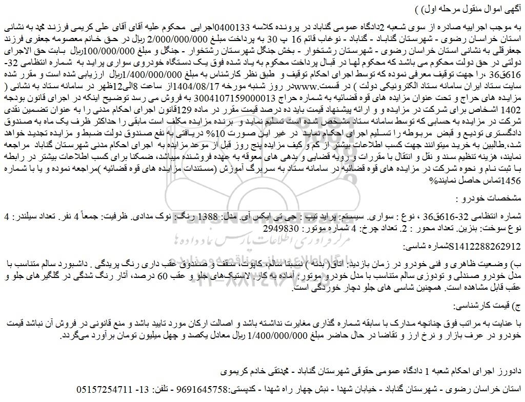 به موجب اجراییه صادره از سوی شعبه 2دادگاه عمومی گناباد در پرونده کلاسه 0400133اجرایی محکوم علیه آقای آقای علی کریمی فرزند محمد به نشانی استان خراسان رضوی - شهرستان گناباد - گناباد - نوغاب قائم 16 پ 30 به پرداخت مبلغ 2/000/000/000 ریال در حق خانم معصومه جعفری فرزند جعفرقلی به نشانی استان خراسان رضوی - شهرستان رشتخوار - بخش جنگل شهرستان رشتخوار - جنگل و مبلغ 100/000/000ریال بابت حق الاجرای دولتی در حق دولت محکوم می باشد که محکوم لها در قبال پرداخت محکوم به یاد شده فوق یک دستگاه خودروی سواری پراید به شماره انتظامی 32-616ق36 ،را جهت توقیف معرفی نموده که توسط اجرای احکام توقیف و طبق نظر کارشناس به مبلغ 1/400/000/000ریال ارزیابی شده است و مقرر شده در روز شنبه مورخه 1404/08/17از ساعت 8الی12ظهر در سامانه ستاد به نشانی (سایت ستاد ایران سامانه ستاد الکترونیکی دولت ) در قسمت مزایده های حراج و تحت عنوان مزایده های قوه قضائیه به شماره حراج 3004107159000013 به فروش می رسد توضیح اینکه در اجرای قانون بودجه 1402 اشخاص برای شرکت در مزایده و و ارائه پیشنهاد قیمت باید ده درصد قیمت مقرر در ماده 129قانون اجرای احکام مدنی را به عنوان تضمین نقدی شرکت در مزایده به حسابی که توسط سامانه ستاد مشخص شده است تسلیم نماید و برنده مزایده مکلف است مابقی را حداکثر ظرف یک ماه به صندوق دادگستری تودیع و قبض مربوطه را تسلیم اجرای احکام نماید در غیر این صورت 10% دریافتی به نفع صندوق دولت ضبط و مزایده تجدید خواهد شد،.طالبین به خرید میتوانند جهت کسب اطلاعات بیشتر از کم و کیف مزایده پنج روز قبل از موعد مزایده به اجرای احکام مدنی شهرستان گناباد مراجعه نمایند، هزینه تنظیم سند و نقل و انتقال با مقررات و رویه قضایی و بدهی های معوقه به عهده فروشنده میباشد، ضمکنا برای کسب اطلاعات بیشتر در رابطه با ثبت نام و نحوه شرکت در مزایده های قوه قضائیه در سامانه ستاد به سربرگ آموزش (مستندات مزایده های قوه قضائیه )مراجعه نموده و یا با شماره 1456تماس حاصل نمایند%