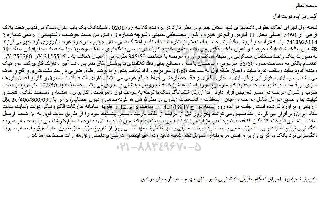 شعبه اول اجرای احکام حقوقی دادگستری شهرستان جهرم در نظر دارد در پرونده کلاسه 0201795 ، ششدانگ یک باب منزل مسکونی قدیمی تحت پلاک ثبتی شماره 5b فرعی از 3460 اصلی بخش 11 فارس واقع در جهرم ، بلوار مصطفی خمینی ، کوچه شماره 3 ، نبش بن بست خوشاب ، کدپستی : 7413935114 را به مزایده و فروش بگذارد . حسب استعلام از اداره ثبت اسناد و املاک شهرستان جهرم ، مرحوم غریب فیروزی فرد جهرمی فرزند شعبان مالک ششدانگ عرصه و اعیان ملک مذکور می باشد . طبق نظریه کارشناس رسمی دادگستری ، ملک موصوف با مختصات جغرافیایی منطقه 39r و x:750860 و y:3155516 ، به صورت یک واحد ساختمان مسکونی در طبقه همکف و اول ، عرصه با مساحت 345/50 مترمربع ، اعیان همکف به انضمام بالکن به مساحت حدود 86/60 مترمربع ، ساختمان با سازه مصالح بنایی فاقد کلافبندی با پوشش طاق ضربی ، نما آجر ، نازک کاری کف موزائیک ، بدنه اندود سفید ، سقف اندود سفید ، اعیان طبقه اول به مساحت 34/60 مترمربع ، فاقد کلاف بندی و با پوشش طاق ضربی در حد سفت کاری و گچ و خاک می باشد . سرمایش ، کولر آبی و گرمایش ، بخاری گازی و فاقد حصارکشی حیاط ضلع غربی می باشد . دارای انشعابات آب ، برق و گاز و اعیان باریک سازی در قسمت حیاط به مساحت حدود 45 مترمربع مورد استفاده آشپزخانه ، سرویس بهداشتی و انباری می باشد . ضمناً حدود 102/50 مترمربع از سمت جنوب و شرق عرصه در مسیر تعریض قرار دارد . لذا ارزش ششدانگ ملک با توجه به مراتب فوق ، موقعیت ، کاربری ، هندسه و مساحت ملک ، قدمت و کیفیت بنا و جمیع عوامل شامل عرصه ، اعیان ، متعلقات و انشعابات (بدون در نظرگرفتن هرگونه بدهی و دیون احتمالی) برابر با 26/406/800/000 ریال ارزیابی و برآورد گردیده است . جلسه مزایده روز شنبه مورخ 1404/08/17 از ساعت 8 الی 12 از طریق سامانه تدارکات الکترونیکی دولت (سایت سایت ستاد ایران) برگزار می گردد . متقاضیان می توانند پنج روز قبل از مزایده از ملک بازدید ، سپس پیشنهاد خود را از طریق سایت فوق به این شعبه ارسال نمایند . تمامی شرکت کنندگان که قصد شرکت در مزایده را دارند ، می بایست مبلغ تضمین شده معادل ده درصد مبلغ کارشناسی را به حساب سپرده دادگستری تودیع نمایند و برنده مزایده می بایست نود درصد مابقی را نهایتاً ظرف مهلت سی روز از تاریخ مزایده از طریق سایت فوق به حساب سپرده دادگستری نزد بانک مرکزی واریز و قبض مربوطه را تحویل دفتر شعبه نماید ؛ در غیراینصورت مبلغ پرداختی وفق مقررات ضبط خواهد شد .