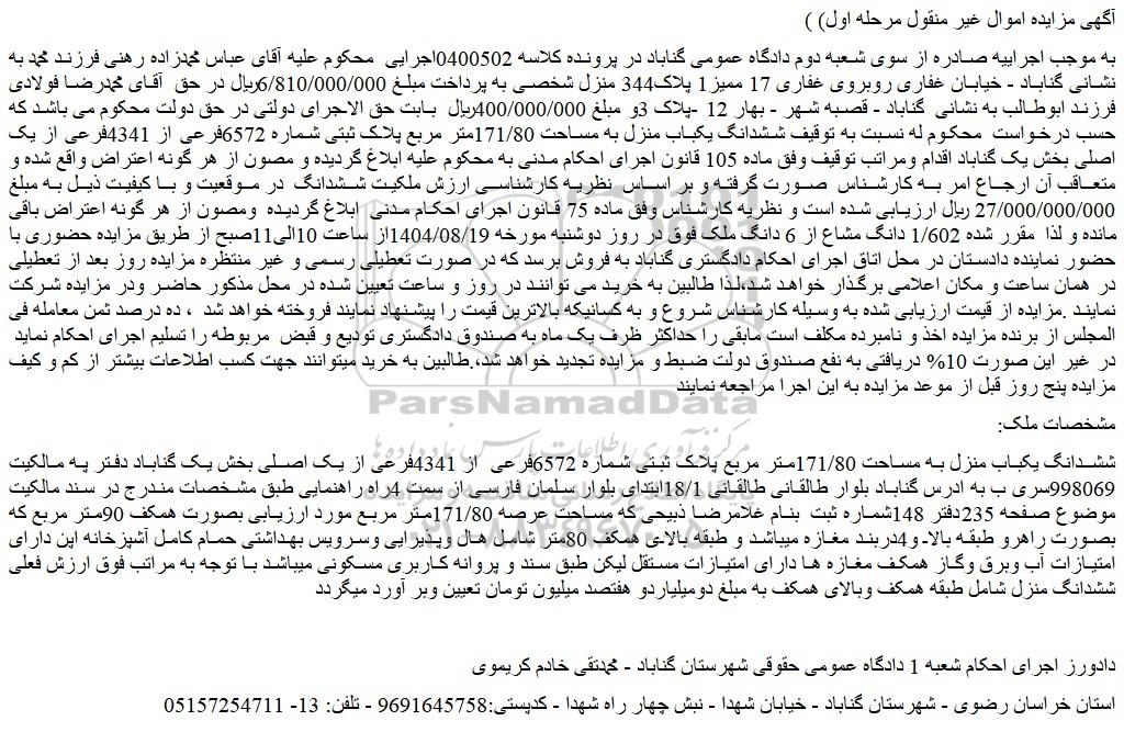 به موجب اجراییه صادره از سوی شعبه دوم دادگاه عمومی گناباد در پرونده کلاسه 0400502اجرایی محکوم علیه آقای عباس محمدزاده رهنی فرزند محمد به نشانی گناباد - خیابان غفاری روبروی غفاری 17 ممیز1 پلاک344 منزل شخصی به پرداخت مبلغ 6/810/000/000ریال در حق آقای محمدرضا فولادی فرزند ابوطالب به نشانی گناباد - قصبه شهر - بهار 12 -پلاک 3و مبلغ 400/000/000ریال بابت حق الاجرای دولتی در حق دولت محکوم می باشد که حسب درخواست محکوم له نسبت به توقیف ششدانگ یکباب منزل به مساحت 171/80متر مربع پلاک ثبتی شماره 6572فرعی از 4341فرعی از یک اصلی بخش یک گناباد اقدام ومراتب توقیف وفق ماده 105 قانون اجرای احکام مدنی به محکوم علیه ابلاغ گردیده و مصون از هر گونه اعتراض واقع شده و متعاقب آن ارجاع امر به کارشناس صورت گرفته و بر اساس نظریه کارشناسی ارزش ملکیت ششدانگ در موقعیت و با کیفیت ذیل به مبلغ 27/000/000/000 ریال ارزیابی شده است و نظریه کارشناس وفق ماده 75 قانون اجرای احکام مدنی ابلاغ گردیده ومصون از هر گونه اعتراض باقی مانده و لذا مقرر شده 1/602 دانگ مشاع از 6 دانگ ملک فوق در روز دوشنبه مورخه 1404/08/19از ساعت 10الی11صبح از طریق مزایده حضوری با حضور نماینده دادستان در محل اتاق اجرای احکام دادگستری گناباد به فروش برسد که در صورت تعطیلی رسمی و غیر منتظره مزایده روز بعد از تعطیلی در همان ساعت و مکان اعلامی برگذار خواهد شد،لذا طالبین به خرید می توانند در روز و ساعت تعیین شده در محل مذکور حاضر ودر مزایده شرکت نمایند .مزایده از قیمت ارزیابی شده به وسیله کارشناس شروع و به کسانیکه بالاترین قیمت را پیشنهاد نمایند فروخته خواهد شد ، ده درصد ثمن معامله فی المجلس از برنده مزایده اخذ و نامبرده مکلف است مابقی را حداکثر ظرف یک ماه به صندوق دادگستری تودیع و قبض مربوطه را تسلیم اجرای احکام نماید در غیر این صورت 10% دریافتی به نفع صندوق دولت ضبط و مزایده تجدید خواهد شد،.طالبین به خرید میتوانند جهت کسب اطلاعات بیشتر از کم و کیف مزایده پنج روز قبل از موعد مزایده به این اجرا مراجعه نمایند