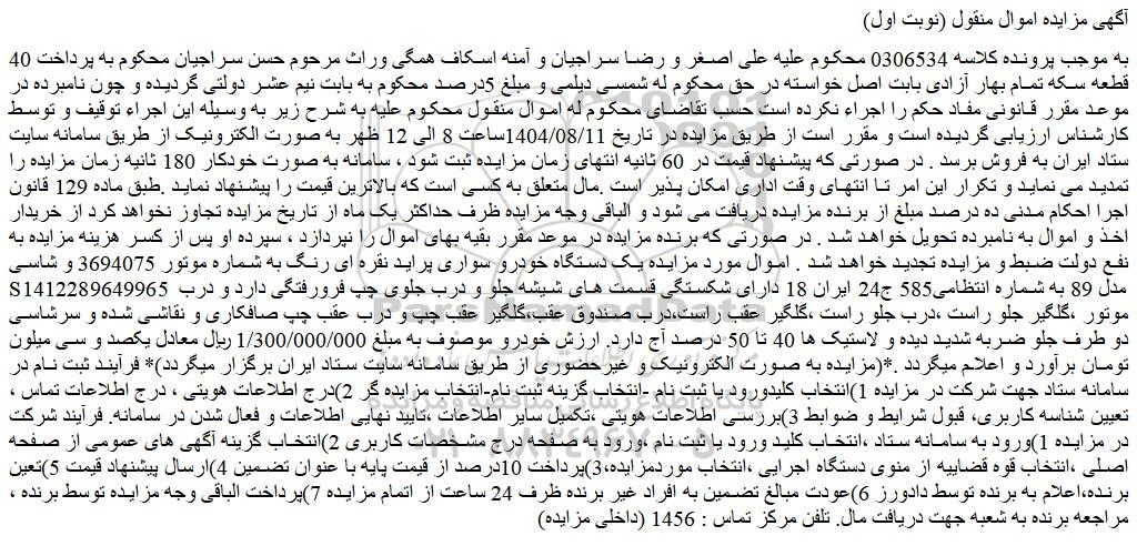 به موجب پرونده کلاسه 0306534 محکوم علیه علی اصغر و رضا سراجیان و آمنه اسکاف همگی وراث مرحوم حسن سراجیان محکوم به پرداخت 40 قطعه سکه تمام بهار آزادی بابت اصل خواسته در حق محکوم له شمسی دیلمی و مبلغ 5درصد محکوم به بابت نیم عشر دولتی گردیده و چون نامبرده در موعد مقرر قانونی مفاد حکم را اجراء نکرده است حسب تقاضای محکوم له اموال منقول محکوم علیه به شرح زیر به وسیله این اجراء توقیف و توسط کارشناس ارزیابی گردیده است و مقرر است از طریق مزایده در تاریخ 1404/08/11ساعت 8 الی 12 ظهر به صورت الکترونیک از طریق سامانه سایت ستاد ایران به فروش برسد . در صورتی که پیشنهاد قیمت در 60 ثانیه انتهای زمان مزایده ثبت شود ، سامانه به صورت خودکار 180 ثانیه زمان مزایده را تمدید می نماید و تکرار این امر تا انتهای وقت اداری امکان پذیر است .مال متعلق به کسی است که بالاترین قیمت را پیشنهاد نماید .طبق ماده 129 قانون اجرا احکام مدنی ده درصد مبلغ از برنده مزایده دریافت می شود و الباقی وجه مزایده ظرف حداکثر یک ماه از تاریخ مزایده تجاوز نخواهد کرد از خریدار اخذ و اموال به نامبرده تحویل خواهد شد . در صورتی که برنده مزایده در موعد مقرر بقیه بهای اموال را نپردازد ، سپرده او پس از کسر هزینه مزایده به نفع دولت ضبط و مزایده تجدید خواهد شد . اموال مورد مزایده یک دستگاه خودرو سواری پراید نقره ای رنگ به شماره موتور 3694075 و شاسی s1412289649965 مدل 89 به شماره انتظامی585 ج24 ایران 18 دارای شکستگی قسمت های شیشه جلو و درب جلوی چپ فرورفتگی دارد و درب موتور ،گلگیر جلو راست ،درب جلو راست ،گلگیر عقب راست،درب صندوق عقب،گلگیر عقب چپ و درب عقب چپ صافکاری و نقاشی شده و سرشاسی دو طرف جلو ضربه شدید دیده و لاستیک ها 40 تا 50 درصد آج دارد. ارزش خودرو موصوف به مبلغ 1/300/000/000 ریال معادل یکصد و سی میلون تومان برآورد و اعلام میگردد .*(مزایده به صورت الکترونیک و غیرحضوری از طریق سامانه سایت ستاد ایران برگزار میگردد)* فرآیند ثبت نام در سامانه ستاد جهت شرکت در مزایده 1)انتخاب کلیدورود یا ثبت نام -انتخاب گزینه ثبت نام-انتخاب مزایده گر 2)درج اطلاعات هویتی ، درج اطلاعات تماس ، تعیین شناسه کاربری، قبول شرایط و ضوابط 3)بررسی اطلاعات هویتی ،تکمیل سایر اطلاعات ،تایید نهایی اطلاعات و فعال شدن در سامانه. فرآیند شرکت در مزایده 1)ورود به سامانه ستاد ،انتخاب کلید ورود یا ثبت نام ،ورود به صفحه درج مشخصات کاربری 2)انتخاب گزینه آگهی های عمومی از صفحه اصلی ،انتخاب قوه قضاییه از منوی دستگاه اجرایی ،انتخاب موردمزایده،3)پرداخت 10درصد از قیمت پایه با عنوان تضمین 4)ارسال پیشنهاد قیمت 5)تعین برنده،اعلام به برنده توسط دادورز 6)عودت مبالغ تضمین به افراد غیر برنده ظرف 24 ساعت از اتمام مزایده 7)پرداخت الباقی وجه مزایده توسط برنده ، مراجعه برنده به شعبه جهت دریافت مال. تلفن مرکز تماس : 1456 (داخلی مزایده)