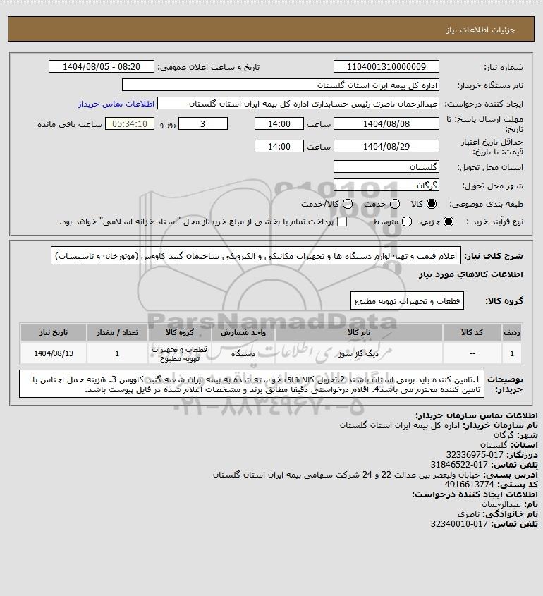 شرح کلی نیاز: اعلام قیمت و تهیه لوازم دستگاه ها و تجهیزات مکانیکی و الکترویکی ساختمان گنبد کاووس (موتورخانه و تاسیسات)