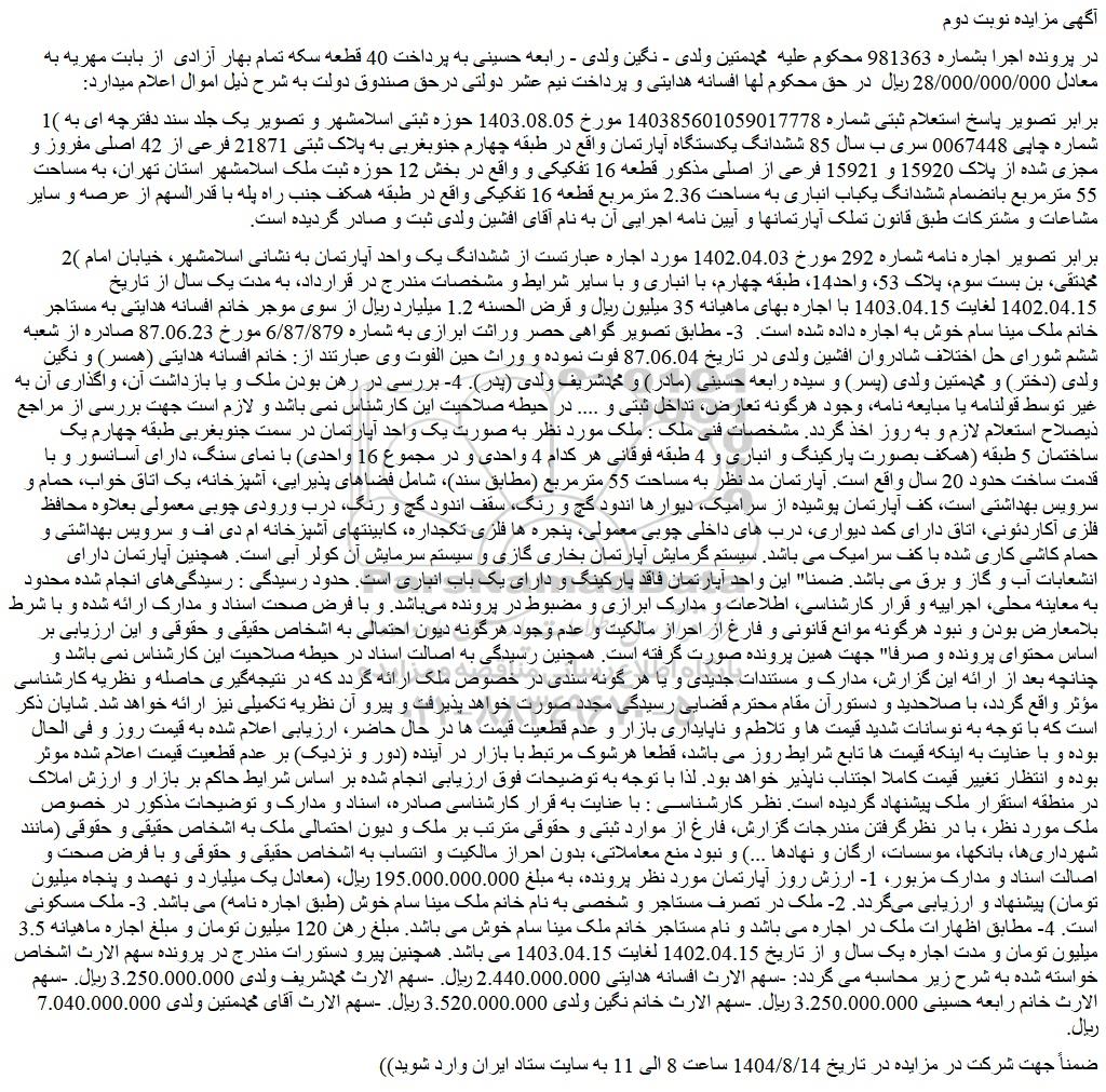 1( برابر تصویر پاسخ استعلام ثبتی شماره 140385601059017778 مورخ 1403.08.05 حوزه ثبتی اسلامشهر و تصویر یک جلد سند دفترچه ای به شماره چاپی 0067448 سری ب سال 85 ششدانگ یکدستگاه آپارتمان واقع در طبقه چهارم جنوبغربی به پلاک ثبتی 21871 فرعی از 42 اصلی مفروز و مجزی شده از پلاک 15920 و 15921 فرعی از اصلی مذکور قطعه 16 تفکیکی و واقع در بخش 12 حوزه ثبت ملک اسلامشهر استان تهران، به مساحت 55 مترمربع بانضمام ششدانگ یکباب انباری به مساحت 2.36 مترمربع قطعه 16 تفکیکی واقع در طبقه همکف جنب راه پله با قدرالسهم از عرصه و سایر مشاعات و مشترکات طبق قانون تملک آپارتمانها و آیین نامه اجرایی آن به نام آقای افشین ولدی ثبت و صادر گردیده است.
