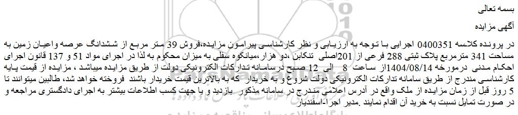 در پرونده کلاسه 0400351 اجرایی با توجه به ارزیابی و نظر کارشناسی پیرامون مزایده،فروش 39 متر مربع از ششدانگ عرصه واعیان زمین به مساحت 341 مترمربع پلاک ثبتی 288 فرعی از 201اصلی  تنکابن ،دو هزار،میانکوه سفلی به میزان محکوم به لذا در اجرای مواد 51 و 137 قانون اجرای احکام مدنی  درمورخه 1404/08/14از ساعت  8  الی  12 صبح درسامانه تدارکات الکترونیکی دولت از طریق مزایده میباشد ، مزایده از قیمت پایه کارشناسی مندرج از طریق سامانه تدارکات الکترونیکی دولت شروع و به خریدار  که به بالاترین قیمت خریدار باشند  فروخته خواهد شد، طالبین میتوانند تا 5 روز قبل از زمان مزایده از ملک واقع در آدرس اعلامی مندرج در سامانه مذکور  بازدید و یا جهت کسب اطلاعات بیشتر به اجرای دادگستری مراجعه و در صورت تمایل نسبت به خرید آن اقدام نمایند .مدیر اجرا-اسفندیار