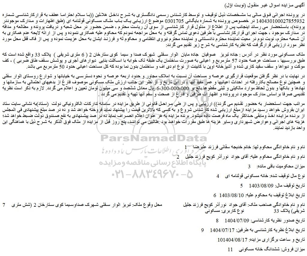 7 نام و نام خانوادگی صاحب ملک: آقای جواد نورآذر کویج فرزند جلیل محل وقوع ملک: تبریز الوار سفلی شهرک صداوسیما کوی ستارخان 2 (شش متری شریفی) پلاک 33 نوع کاربری: مسکونی