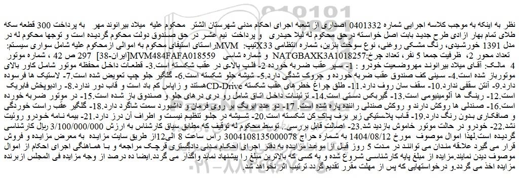 نظر به اینکه به موجب کلاسه اجرایی شماره 0401332 اصداری از شعبه اجرای احکام مدنی شهرستان الشتر  محکوم علیه  میلاد بیرانوند مهر   به پرداخت 300 قطعه سکه طلای تمام بهار ازادی طرح جدید بابت اصل خواسته درحق محکوم له لیلا حیدری   و پرداخت  نیم عشر در حق صندوق دولت محکوم گردیده است و توجها محکوم له در راستای استیفای محکوم به اموالی ازمحکوم علیه شامل سواری سیستم: mvm تیپ: x33 مدل 1391 خورشیدی، رنگ مشکی روغنی، نوع سوخت بنزین، شماره انتظامی ‏‎]‎ایران-38‏‎[‎‏  ‏‏297 ص 42 ، شماره موتور ‏‎mvm484fafa018559 ‎‏ ‏ و شماره شاسی  ‏natgbaxk3a1018257‎‏  تعداد محور 2، ‏ ظرفیت جمعا 5 نفر، تعداد چرخ: 4  مالک: آقای میلاد بیرانوند مهروضعیت خودرو : 1- سپر عقب ضربه خورده 2- فلپ بالای در عقب شکسته است.3- قطعات داخل محفظه موتور شامل کاور بالای موتورباز شده است.4- سینی کف صندوق عقب ضربه خورده و چروک شدگی دارد.5- شیشه جلو شکسته است.6- گلگیر جلو چپ تعویض شده است.7- لاستیک ها فرسوده هستند و زاپاس کم باد است و قاب دور ندارد.8- رادیوپخش فابریک cd-drive دارد.9- آنتن سقفی ندارد.10- سقف سان روف دارد.11- طلق چراغ خطرهای عقب شکسته است.12- رینگ ها آلومینیومی است.13- گیربکس دستی است.14- تزئینات داخل اتاق شامل رو دری درهای جلو و صندوق باز شده است.15- در موتور ضربه خورده است.16- صندلی ها روکش دارند و روکش صندلی راننده پاره شده است. 17- دو عدد ایربگ بر روی فرمان و داشبورد سمت شاگرد دارد.18- گلگیر عقب راست خوردگی و صافکاری بدون رنگ دارد.19- قاب پلاستیکی زیر برف پاک کن شکسته است.20- شیشه در جلو تنظیم نیست و اطراف آن درز دارد.21- بیمه نامه خودرو روئیت نشد.22- خودرو در حالت موتور خاموش بازدید شد.23- اصالت قابل بررسی.. توسط محکوم له توقیف که مطابق سیاق کارشناس به ارزش 3/100/000/000 ریال کارشناسی گردیده است.لهذا اموال موصوف  مورخ 1404/08/12 به شماره حراج 3004108135000078 راس ساعت 8 الی12از طریق سایت مزایده  به معرض مزایده و فروش قرار می گیرد علاقه مندان می توانند در مدت 5 روز قبل از موعد مزایده به دفتر اجرای احکام مدنی دادگستری قرچک مراجعه و با هماهنگی اجرای احکام از اموال موصوف دیدن نمایند.مزایده از مبلغ پایه کارشناسی شروع شده و به کسی که بالاترین مبلغ را پیشنهاد نماید واگذار می گردد.ایضا ده درصد از وجه مزایده فی المجلس ازبرنده مزایده اخذ می گردد.و درخواستهایی که پس از مهلت مقرر تقدیم گردد ترتیب اثر نخواهد شد.