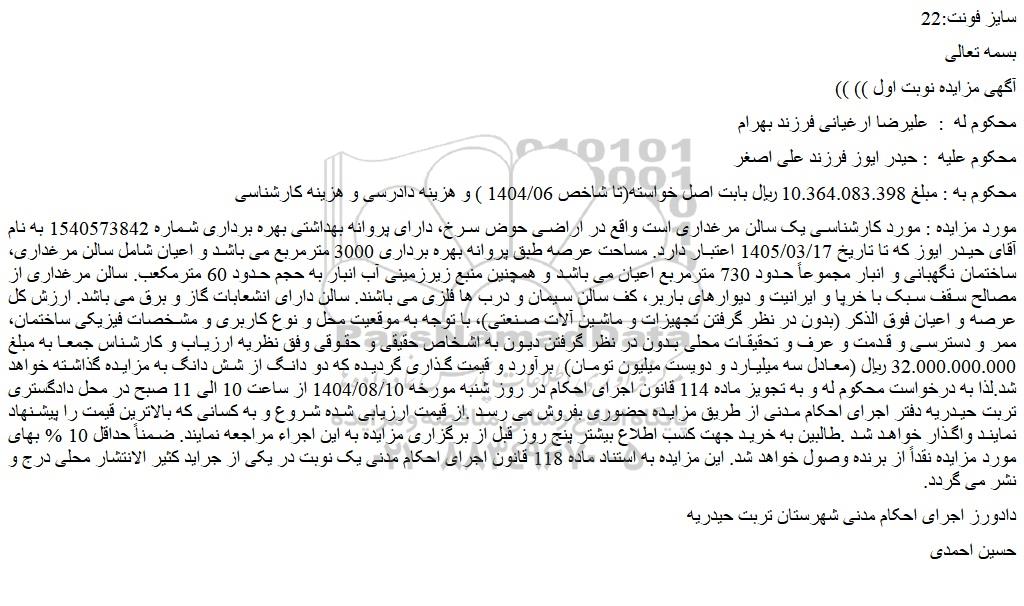 مورد مزایده : مورد کارشناسی یک سالن مرغداری است واقع در اراضی حوض سرخ، دارای پروانه بهداشتی بهره برداری شماره 1540573842 به نام آقای حیدر ایوز که تا تاریخ 1405/03/17 اعتبار دارد. مساحت عرصه طبق پروانه بهره برداری 3000 مترمربع می باشد و اعیان شامل سالن مرغداری، ساختمان نگهبانی و انبار مجموعاً حدود 730 مترمربع اعیان می باشد و همچنین منبع زیرزمینی آب انبار به حجم حدود 60 مترمکعب. سالن مرغداری از مصالح سقف سبک با خرپا و ایرانیت و دیوارهای باربر، کف سالن سیمان و درب ها فلزی می باشند. سالن دارای انشعابات گاز و برق می باشد. ارزش کل عرصه و اعیان فوق الذکر (بدون در نظر گرفتن تجهیزات و ماشین آلات صنعتی)، با توجه به موقعیت محل و نوع کاربری و مشخصات فیزیکی ساختمان، ممر و دسترسی و قدمت و عرف و تحقیقات محلی بدون در نظر گرفتن دیون به اشخاص حقیقی و حقوقی وفق نظریه ارزیاب و کارشناس جمعا به مبلغ 32.000.000.000 ریال (معادل سه میلیارد و دویست میلیون تومان) برآورد و قیمت گذاری گردیده که دو دانگ از شش دانگ به مزایده گذاشته خواهد شد.لذا به درخواست محکوم له و به تجویز ماده 114 قانون اجرای احکام در روز شنبه مورخه 1404/08/10 از ساعت 10 الی 11 صبح در محل دادگستری تربت حیدریه دفتر اجرای احکام مدنی از طریق مزایده حضوری بفروش می رسد .از قیمت ارزیابی شده شروع و به کسانی که بالاترین قیمت را پیشنهاد نمایند واگذار خواهد شد .طالبین به خرید جهت کسب اطلاع بیشتر پنج روز قبل از برگزاری مزایده به این اجراء مراجعه نمایند. ضمناً حداقل 10 % بهای مورد مزایده نقداً از برنده وصول خواهد شد. این مزایده به استناد ماده 118 قانون اجرای احکام مدنی یک نوبت در یکی از جراید کثیر الانتشار محلی درج و نشر می گردد.