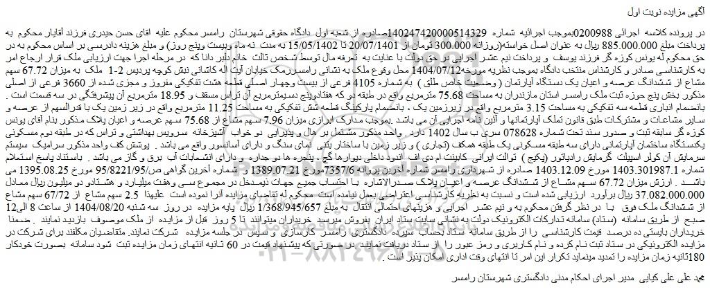 در پرونده کلاسه  اجرائی 0200988بموجب اجرائیه  شماره  140247420000514329صادره از شعبه اول  دادگاه حقوقی شهرستان  رامسر محکوم علیه  اقای حسن حیدری فرزند آقایار محکوم  به پرداخت مبلغ 885.000.000 ریال به عنوان اصل خواسته(روزانه 300.000 تومان از 20/07/1401 تا 15/05/1402 به مدت  نه ماه وبیست وپنج روز) و مبلغ هزینه دادرسی بر اساس محکوم به در حق محکوم له یونس کوزه گر فرزند یوسف  و پرداخت نیم عشر اجرایی در حق دولت با عنایت به  تعرفه مال توسط شخص ثالث  خانم دلبر دانا که  در مرحله اجرا جهت ارزیابی ملک قرار ارجاع امر به کارشناسی صادر و کارشناس منتخب دادگاه بموجب نظریه مورخه1404/07/12 محل وقوع ملک به نشانی رامسررمک خیابان آیت اله کاشانی نبش کوچه پردیس 2-1  ملک  به میزان 67.72 سهم مشاع از ششدانگ عرصه و اعیان یک دستگاه آپارتمان ( وضعیت خاص طلق )  به شماره 4105 فرعی از بیست وچهار اصلی قطعه هشت تفکیکی مفروز و مجزی شده از 3660 فرعی از اصلی مذکور بخش پنج حوزه ثبت ملک رامسر استان مازندران به مساحت 75.68 مترمربع واقع در طبقه دو که هفتادوپنج دسیمترمربع آن تراس مسقف و 18.95 مترمربع آن پیشرفتگی در سه قسمت است . بانضمام انباری قطعه سه تفکیکی به مساحت 3.15 مترمربع واقع در زیرزمین یک ، بانضمام پارکینگ قطعه شش تفکیکی به مساحت 11.25 مترمربع واقع در زیر زمین یک با قدرالسهم از عرصه و سایر مشاعات و مشترکات طبق قانون تملک آپارتمانها و آئین نامه اجرایی آن می باشد .بموجب مدارک ابرازی میزان 7.96 سهم مشاع از 75.68 سهم عرصه و اعیان پلاک مذکور بنام آقای یونس کوزه گر سابقه ثبت و صدور سند تحت شماره 078628 سری ب سال 1402 دارد . واحد مذکور مشتمل بر هال و پذیرایی  دو خواب  آشپزخانه  سرویس بهداشتی و تراس که در طبقه دوم مسکونی یکدستگاه ساختمان آپارتمانی دارای سه طبقه مسکونی یک طبقه همکف (تجاری ) و زیر زمین با ساختار بتنی  نمای سنگ و دارای آسانسور واقع می باشد .  پوشش کف واحد مذکور سرامیک  سیستم سرمایش آن کولر اسپیلت  گرمایش رادیاتور (پکیج )  توالت ایرانی  کابینت ام دی اف  اندود داخلی دیوارها گچ ، پنجره ها دو جداره  و دارای انشعابات آب  برق و گاز می باشد .  باستناد پاسخ استعلام شماره 1403.301987.1 مورخ 1403.12.09 صادره از شهرداری رامسر شماره آخرین پروانه 7357/6مورخ 1389.07.21 و  شماره آخرین گواهی ص/95/8221/95 مورخ 1395.08.25 می باشد . ارزش میزان 67.72 سهم مشاع از ششدانگ عرصه و اعیان پلاک صدرالاشاره  با احتساب جمیع جهات ذیمدخل در مجموع سی وهفت میلیارد و هشتادو دو میلیون ریال معادل 37.082.000.000 ریال برآورد  ارزیابی شده است و نسبت به نظریه کارشناسی اعتراضی بعمل نیامده است  محکوم له تقاضای مزایده آنرا نموده است  علیهذا  2.5 سهم مشاع  از 67/72 سهم مشاع از ششدانگ ملک فوق   با  در نظر گرفتن محکوم به و نیم عشر  اجرایی و هزینهای احتمالی انتقال  به مبلغ 1/368/945/657 ریال  پایه مزایده  در روز  سه شنبه 1404/08/20 از ساعت 8 الی12 صبح  از طریق سامانه  (ستاد) سامانه تدارکات الکترونیک دولت به نشانی سایت ستاد ایران  بفروش میرسد  خریداران میتوانند  تا 5 روز  قبل از مزایده  از ملک موصوف  بازدید نمایند  . ضمنا  خریداران بایستی ده درصد  قیمت کارشناسی  را از طریق سامانه  ستاد بحساب  سپرده  دادگستری  رامسر  کارسازی  و سپس  در جلسه مزایده   شرکت نمایند. متقاضیان مکلفند برای شرکت در مزایده الکترونیکی در ستاد ثبت نام کرده و نام کاربری و رمز عبور را  از ستاد دریافت نمایند .در صورتی که پیشنهاد قیمت در 60 ثانیه انتهای زمان مزایده ثبت  شود سامانه  بصورت خودکار 180ثانیه زمان مزایده را تمدید مینماید تکرار این امر تا انتهای وقت اداری امکان پذیر است .