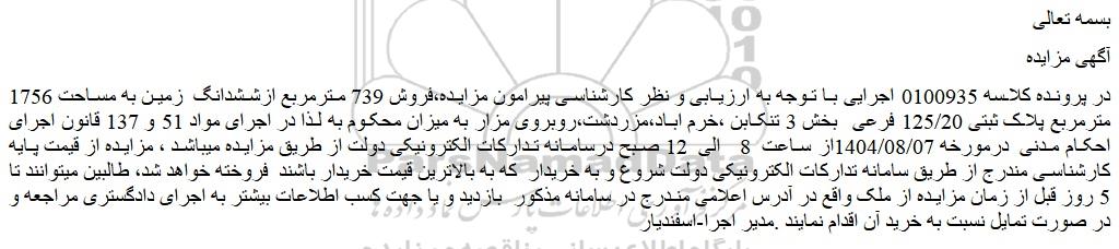 در پرونده کلاسه 0100935 اجرایی با توجه به ارزیابی و نظر کارشناسی پیرامون مزایده،فروش 739 مترمربع ازششدانگ  زمین به مساحت 1756 مترمربع پلاک ثبتی 125/20 فرعی  بخش 3 تنکابن ،خرم اباد،مزردشت،روبروی مزار به میزان محکوم به لذا در اجرای مواد 51 و 137 قانون اجرای احکام مدنی  درمورخه 1404/08/07از ساعت  8  الی  12 صبح درسامانه تدارکات الکترونیکی دولت از طریق مزایده میباشد ، مزایده از قیمت پایه کارشناسی مندرج از طریق سامانه تدارکات الکترونیکی دولت شروع و به خریدار  که به بالاترین قیمت خریدار باشند  فروخته خواهد شد، طالبین میتوانند تا 5 روز قبل از زمان مزایده از ملک واقع در آدرس اعلامی مندرج در سامانه مذکور  بازدید و یا جهت کسب اطلاعات بیشتر به اجرای دادگستری مراجعه و در صورت تمایل نسبت به خرید آن اقدام نمایند .مدیر اجرا-اسفندیار