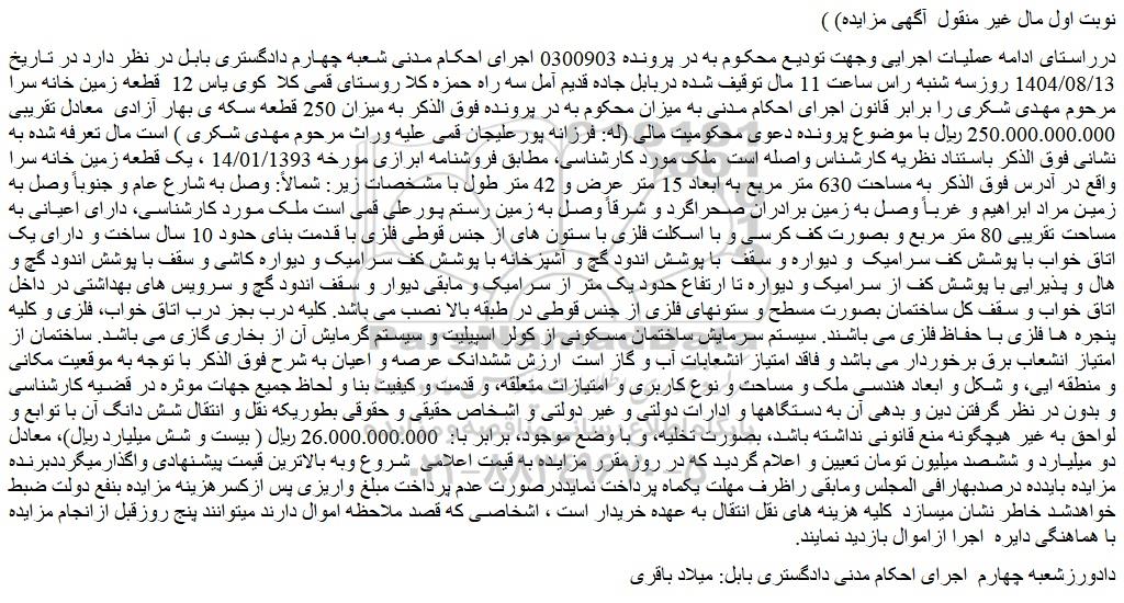 درراستای ادامه عملیات اجرایی وجهت تودیع محکوم به در پرونده 0300903 اجرای احکام مدنی شعبه چهارم دادگستری بابل در نظر دارد در تاریخ 1404/08/13 روزسه شنبه راس ساعت 11 مال توقیف شده دربابل جاده قدیم آمل سه راه حمزه کلا روستای قمی کلا کوی یاس 12 قطعه زمین خانه سرا مرحوم مهدی شکری را برابر قانون اجرای احکام مدنی به میزان محکوم به در پرونده فوق الذکر به میزان 250 قطعه سکه ی بهار آزادی معادل تقریبی 250.000.000.000 ریال با موضوع پرونده دعوی محکومیت مالی (له: فرزانه پورعلیجان قمی علیه وراث مرحوم مهدی شکری ) است مال تعرفه شده به نشانی فوق الذکر باستناد نظریه کارشناس واصله است ملک مورد کارشناسی، مطابق فروشنامه ابرازی مورخه 14/01/1393 ، یک قطعه زمین خانه سرا واقع در آدرس فوق الذکر به مساحت 630 متر مربع به ابعاد 15 متر عرض و 42 متر طول با مشخصات زیر: شمالاً: وصل به شارع عام و جنوباً وصل به زمین مراد ابراهیم و غرباً وصل به زمین برادران صحراگرد و شرقاً وصل به زمین رستم پورعلی قمی است ملک مورد کارشناسی، دارای اعیانی به مساحت تقریبی 80 متر مربع و بصورت کف کرسی و با اسکلت فلزی با ستون های از جنس قوطی فلزی با قدمت بنای حدود 10 سال ساخت و دارای یک اتاق خواب با پوشش کف سرامیک و دیواره و سقف با پوشش اندود گچ و آشپزخانه با پوشش کف سرامیک و دیواره کاشی و سقف با پوشش اندود گچ و هال و پذیرایی با پوشش کف از سرامیک و دیواره تا ارتفاع حدود یک متر از سرامیک و مابقی دیوار و سقف اندود گچ و سرویس های بهداشتی در داخل اتاق خواب و سقف کل ساختمان بصورت مسطح و ستونهای فلزی از جنس قوطی در طبقه بالا نصب می باشد. کلیه درب بجز درب اتاق خواب، فلزی و کلیه پنجره ها فلزی با حفاظ فلزی می باشند. سیستم سرمایش ساختمان مسکونی از کولر اسپیلیت و سیستم گرمایش آن از بخاری گازی می باشد. ساختمان از امتیاز انشعاب برق برخوردار می باشد و فاقد امتیاز انشعابات آب و گاز است ارزش ششدانک عرصه و اعیان به شرح فوق الذکر با توجه به موقعیت مکانی و منطقه ایی، و شکل و ابعاد هندسی ملک و مساحت و نوع کاربری و امتیازات متعلقه، و قدمت و کیفیت بنا و لحاظ جمیع جهات موثره در قضیه کارشناسی و بدون در نظر گرفتن دین و بدهی آن به دستگاهها و ادارات دولتی و غیر دولتی و اشخاص حقیقی و حقوقی بطوریکه نقل و انتقال شش دانگ آن با توابع و لواحق به غیر هیچگونه منع قانونی نداشته باشد، بصورت تخلیه، و با وضع موجود، برابر با: 26.000.000.000 ریال ( بیست و شش میلیارد ریال)، معادل دو میلیارد و ششصد میلیون تومان تعیین و اعلام گردید که در روزمقرر مزایده به قیمت اعلامی شروع وبه بالاترین قیمت پیشنهادی واگذارمیگرددبرنده مزایده بایدده درصدبهارافی المجلس ومابقی راظرف مهلت یکماه پرداخت نمایددرصورت عدم پرداخت مبلغ واریزی پس ازکسرهزینه مزایده بنفع دولت ضبط خواهدشد خاطر نشان میسازد کلیه هزینه های نقل انتقال به عهده خریدار است ، اشخاصی که قصد ملاحظه اموال دارند میتوانند پنج روزقبل ازانجام مزایده با هماهنگی دایره اجرا ازاموال بازدید نمایند.