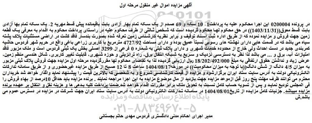 در پرونده 0200004 این اجرا محکوم علیه به پرداخت1- 10 سکه و 69 صدم از یک سکه تمام بهار آزادی بابت باقیمانده پیش قسط مهریه 2- یک سکه تمام بها آزادی بابت قسط معوق((1403/11/31)) در حق محکوم لها محکوم گردیده است که شخص ثالثی از طرف محکوم علیه در راستای پرداخت محکوم به اقدام به معرفی یک قطعه زمین جهت فروش و مزایده نموده که از طریق اداره ثبت اسناد توقیف و برابر نظریه کارشناس زمین تعرفه شده بصورت بندسار فاقد کشت در اراضی مستثنیات پلاک پشته سیاه می باشد که در قسمت هایی دارای نهشته های رسوبی نسبتاً عمیق بوده و دارای مساحت 4727/92 مترمربع با کاربری زراعی باغی واقع در حریم شهر فردوس حاشیه کمربندی جدید در دست احداث ولی خارج از محدوده خدمات شهری و دارای پلاک ثبتی به شماره 0 فرعی از 3299 اصلی بخش یک ثبتی فردوس است و ملک مزبور فاقد امتیازات آب، برق و ... می باشد لذا نظر به دسترسی نزدیک و سریع به شبکه انتقال برق، راه ترانزیتی و حوزه شهری، قابلیت تغییر کاربری، شکل هندسی منظم زمین، عرض زیاد و نداشتن حقوق ارتفاقی به مبلغً 18/202/492/000 ریال ارزیابی گردیده لذا به تقاضای محکوم لها مقررگردیده مرحله اول مزایده جهت فروش پلاک ثبتی مزبور به میزان 4/5 دانگ از شش دانگ((با توجه به میزان محکومیت)) در مورخه1404/08/17 ساعت 8 تا 12 صبح از طریق مزایده غیرحضوری و از طریق سامانه تدارکات الکترونیکی دولت به آدرس سایت ستاد ایران برگزارشود و مزایده از قیمت کارشناسی شروع و به شخصی که بالاترین قیمت را پیشنهاد نماید واگذار خواهد شد خریداران محترم می توانند ظرف مهلت پنج روز قبل ازموعد مزایده جهت بازدید از مال موضوع مزایده به این اجرا مراجعه نمایند . برنده مزایده باید حداقل 10درصد از بهاء فروش را فی المجلس تودیع نماید و پس از تسویه حساب کامل نسبت به تحویل ملک برابر مقررات اقدام خواهد شد.ضمنا پرداخت کلیه بدهی ها و هزینه نقل و انتقال بر عهده برنده مزایده میباشد. جزئیات کامل مزایده از تاریخ1404/08/01 در سامانه تدارکات الکترونیکی دولت به آدرس سایت ستاد ایران جهت شرکت در مزایده در دسترس عموم می باشد.ش
