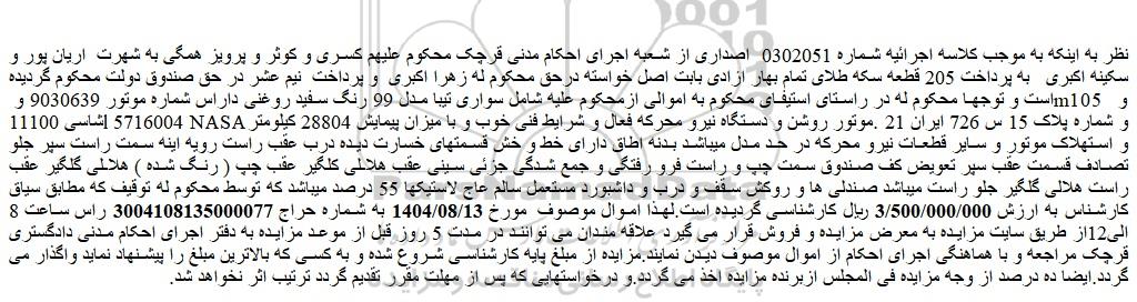 نظر به اینکه به موجب کلاسه اجرائیه شماره 0302051 اصداری از شعبه اجرای احکام مدنی قرچک محکوم علیهم کسری و کوثر و پرویز همگی به شهرت اریان پور و سکینه اکبری به پرداخت 205 قطعه سکه طلای تمام بهار ازادی بابت اصل خواسته درحق محکوم له زهرا اکبری و پرداخت نیم عشر در حق صندوق دولت محکوم گردیده است و توجها محکوم له در راستای استیفای محکوم به اموالی ازمحکوم علیه شامل سواری تیبا مدل 99 رنگ سفید روغنی داراس شماره موتور 9030639 و m105 و شاسی 11100l 5716004 nasa و شماره پلاک 15 س 726 ایران 21 .موتور روشن و دستگاه نیرو محرکه فعال و شرایط فنی خوب و با میزان پیمایش 28804 کیلومتر و استهلاک موتور و سایر قطعات نیرو محرکه در حد مدل میباشد بدنه اطاق دارای خط و خش قسمتهای خسارت دیده درب عقب راست رویه اینه سمت راست سپر جلو تصادف قسمت عقب سپر تعویض کف صندوق سمت چپ و راست فرو رفتگی و جمع شدگی جزئی سینی عقب هلالی کلگیر عقب چپ ( رنگ شده ) هلالی گلگیر عقب راست هلالی گلگیر جلو راست میباشد صندلی ها و روکش سقف و درب و داشبورد مستعمل سالم عاج لاستیکها 55 درصد میباشد که توسط محکوم له توقیف که مطابق سیاق کارشناس به ارزش 3/500/000/000 ریال کارشناسی گردیده است.لهذا اموال موصوف مورخ 1404/08/13 به شماره حراج 3004108135000077 راس ساعت 8 الی12از طریق سایت مزایده به معرض مزایده و فروش قرار می گیرد علاقه مندان می توانند در مدت 5 روز قبل از موعد مزایده به دفتر اجرای احکام مدنی دادگستری قرچک مراجعه و با هماهنگی اجرای احکام از اموال موصوف دیدن نمایند.مزایده از مبلغ پایه کارشناسی شروع شده و به کسی که بالاترین مبلغ را پیشنهاد نماید واگذار می گردد.ایضا ده درصد از وجه مزایده فی المجلس ازبرنده مزایده اخذ می گردد.و درخواستهایی که پس از مهلت مقرر تقدیم گردد ترتیب اثر نخواهد شد.