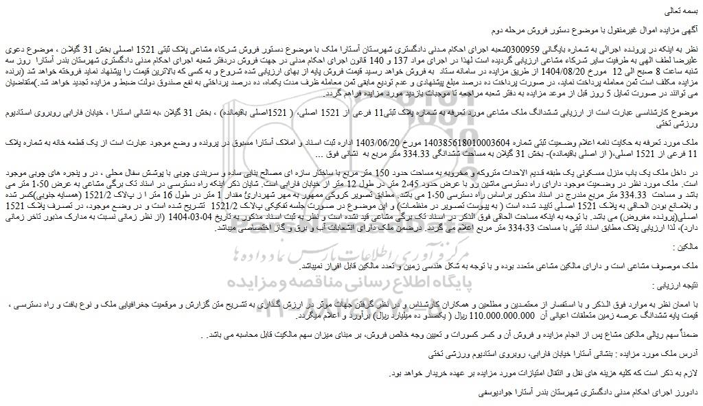 نظر به اینکه در پرونده اجرائی به شماره بایگانی 0300959شعبه اجرای احکام مدنی دادگستری شهرستان آستارا ملک با موضوع دستور فروش شرکاء مشاعی پلاک ثبتی 1521 اصلی بخش 31 گیلان ، موضوع دعوی علیرضا لطف الهی به طرفیت سایر شرکاء مشاعی ارزیابی گردیده است لهذا در اجرای مواد 137 و 140 قانون اجرای احکام مدنی در جهت فروش دردفتر شعبه اجرای احکام مدنی دادگستری شهرستان بندر آستارا روز سه شنبه ساعت 8 صبح الی 12 مورخ 1404/08/20 از طریق مزایده در سامانه ستاد به فروش خواهد رسید قیمت فروش پایه از بهای ارزیابی شده شروع و به کسی که بالاترین قیمت را پیشنهاد نماید فروخته خواهد شد (برنده مزایده مکلف است ثمن معامله پرداخت نماید، در صورت پرداخت ده درصد مبلغ پیشنهادی و عدم تودیع مابقی ثمن معامله ظرف مدت یکماه، ده درصد پرداختی به نفع صندوق دولت ضبط و مزایده تجدید خواهد شد.)متقاضیان می توانند در صورت تمایل 5 روز قبل از موعد مزایده به دفتر شعبه مراجعه تا موجبات بازدید مورد مزایده فراهم گردد.
