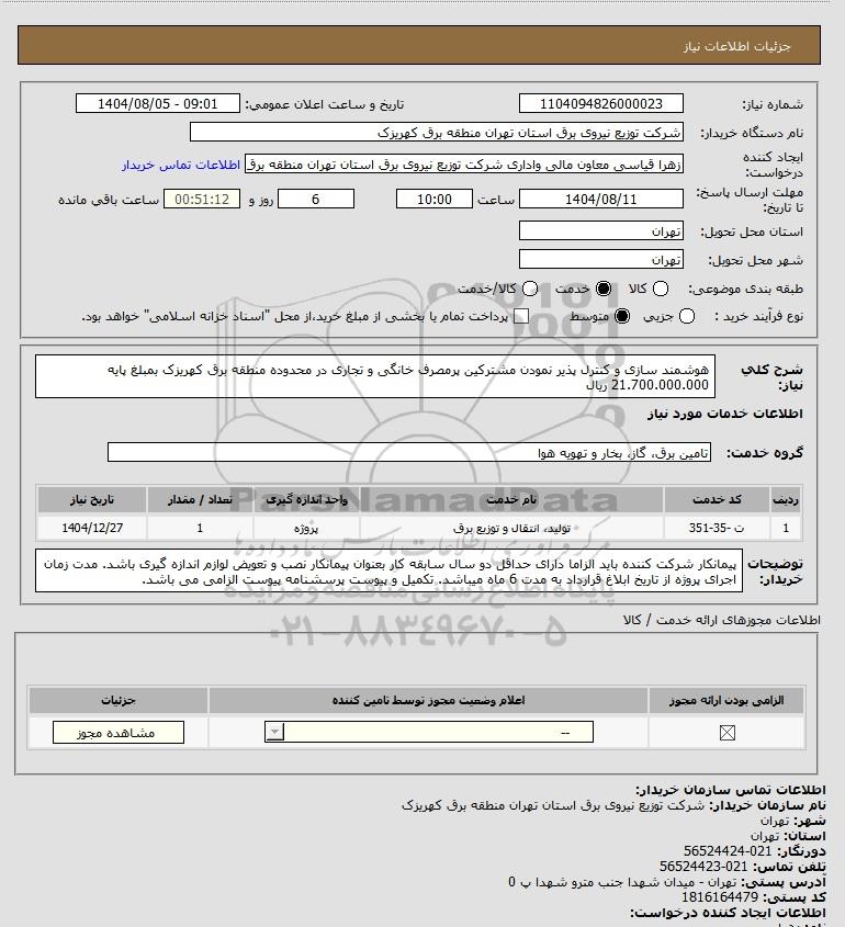 شرح کلی نیاز: هوشمند سازی و کنترل پذیر نمودن مشترکین پرمصرف خانگی و تجاری در محدوده منطقه برق کهریزک بمبلغ پایه 21.700.000.000 ریال