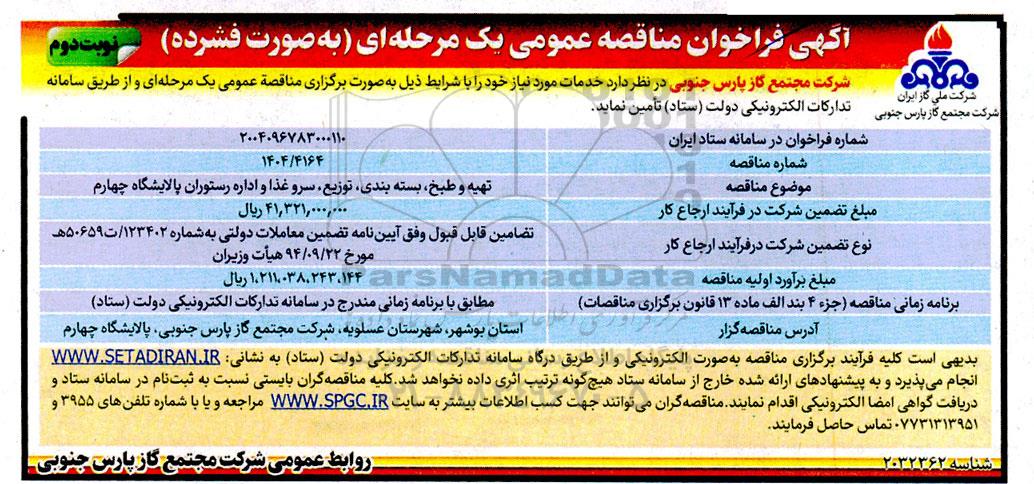 شرکت مجتمع گاز پارس جنوبی در نظر دارد خدمات مورد نیاز خود را با شرایط ذیل بصورت برگزاری مناقصه عمومی یک مرحله ای و از طریق سامانه تدارکات الکترونیکی دولت سامانه (ستاد) تامین نماید.