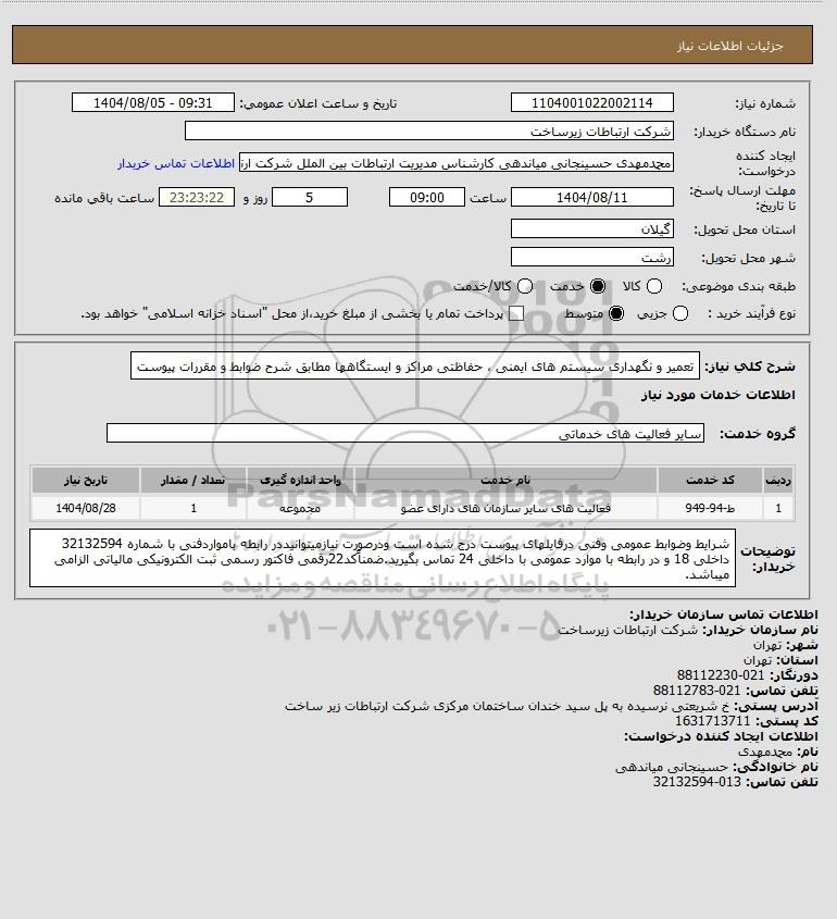 استعلام بها و موضوع استعلام استعلام تعمیر و نگهداری سیستم های ایمنی ، حفاظتی مراکز و ایستگاهها مطابق شرح ضوابط و مقررات پیوست به اطلاع کلیه شرکتها و افراد متخصص واجد شرایط میرساند، آگهی گذار در نظر دارد از طریق استعلام بها، نسبت به انتخاب و دریافت پیشنهادات اقدام نماید. این استعلام با کد آگهی ثبت شده در سامانه خبرگزاری پارس نماد : 9758110 منتشر شده است. مشخصات استعلام : تاریخ شروع استعلام: 1404/08/05 آخرین مهلت ارسال پیشنهاد قیمت : 1404/08/11 و محل اجرای پروژه : استان گیلان میباشد. استعلام قیمت مورد درخواست : استعلام تعمیر و نگهداری سیستم های ایمنی ، حفاظتی مراکز و ایستگاهها مطابق شرح ضوابط و مقررات پیوست با دستهبندیهای تخصصی و گروه های مرتبط : سیستم های حفاظتی-دوربین مدار بسته،دزدگیر،آیفون تصویری و آنتن مرکزی, سیستم ایمنی ، اتش نشانی،اعلام و اطفای حریق, استعلام اطلاع رسانی میگردد.