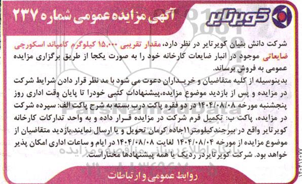 بدینوسیله از کلیه متقاضیان و خریداران دعوت میشود با مد نظر قرار دادن شرایط شرکت در مزایده و پس از بازدید موضوع مزایده پیشنهادات کتبی خود را تا پایان وقت اداری روز پنجشنبه مورخه 1404.08.08 در دو فقره پاکت درب بسته به شرح پاکت الف: سپرده شرکت در مزایده پاکت ب تکمیل فرم شرکت در مزایده قرار داده و به واحد تدارکات کارخانه کویر تایر واقع در بیرجند کیلومتر 11 جاده کرمان تحویل و یا ارسال نمایند. بازدید متقاضیان از موضوع مزایده از مورخه 1404.08.04 لغایت 1404.08.08 در ایام و ساعات اداری امکان پذیر خواهد بود. شرکت کویر تایر در ردیک یا همه پیشنهادها مختار است.